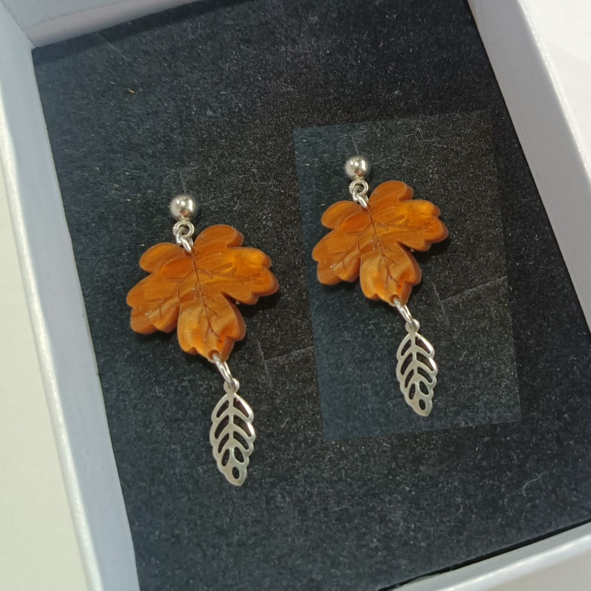 Nuestros pendientes son el complemento perfecto para tu look de otoño. Realizados en nuestro taller con materiales acrílicos, sus formas nos recuerdan a esta estación, son pendientes ligeros y duraderos. Con enganche y argollas de acero inoxidable, miden aproximadamente 3.5 cm. Consigue un look único, divertido y elegante con estos pendientes.